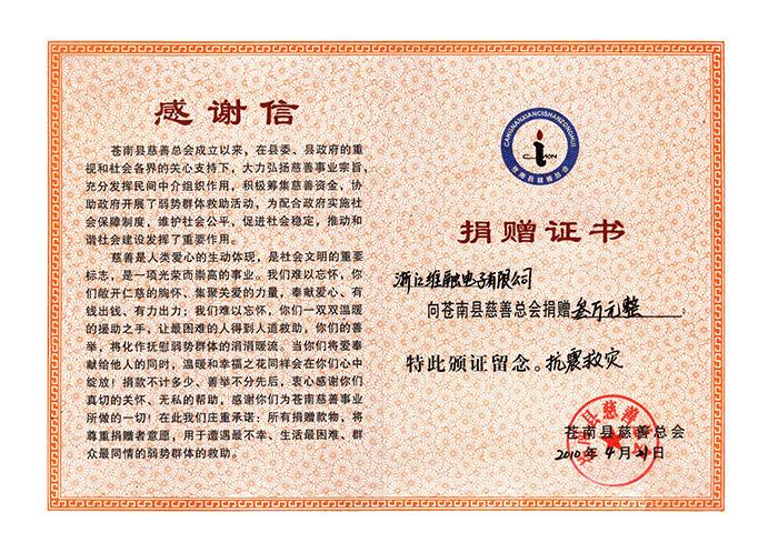 08年維融-捐贈證書10年玉樹地震捐款
